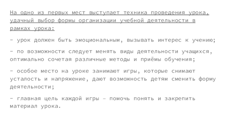 На одно из первых мест выступает техника проведения урока, удачный выбор формы организации учебной деятельности в рамках