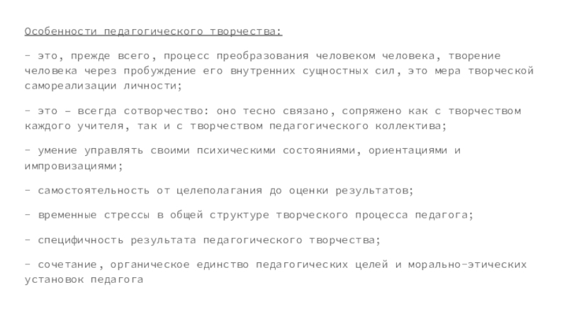 Особенности педагогического творчества:- это, прежде всего, процесс преобразования человеком человека, творение человека через пробуждение его внутренних сущностных