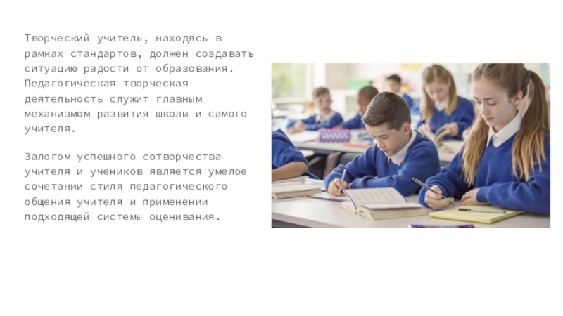 Творческий учитель, находясь в рамках стандартов, должен создавать ситуацию радости от образования. Педагогическая творческая деятельность служит главным