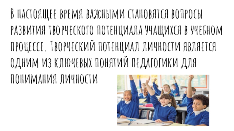 Слайд 2В настоящее время важными становятся вопросы развития творческого потенциала учащихся