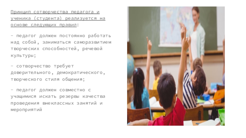 Принцип сотворчества педагога и ученика (студента) реализуется на основе следующих правил:- педагог должен постоянно работать над собой,