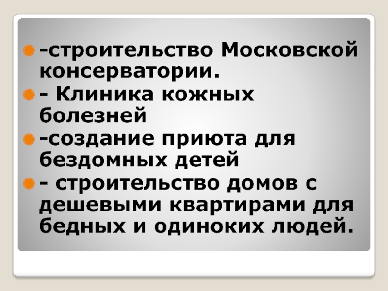 -строительство Московской консерватории. - Клиника кожных болезней-создание приюта для бездомных детей- строительство домов с дешевыми квартирами для