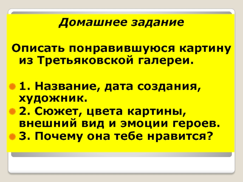 Домашнее заданиеОписать понравившуюся картину из Третьяковской галереи. 1. Название, дата создания, художник.2. Сюжет, цвета картины, внешний вид