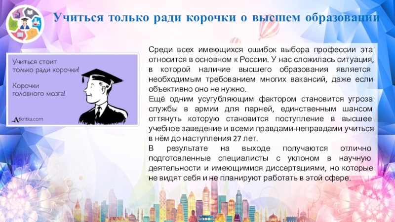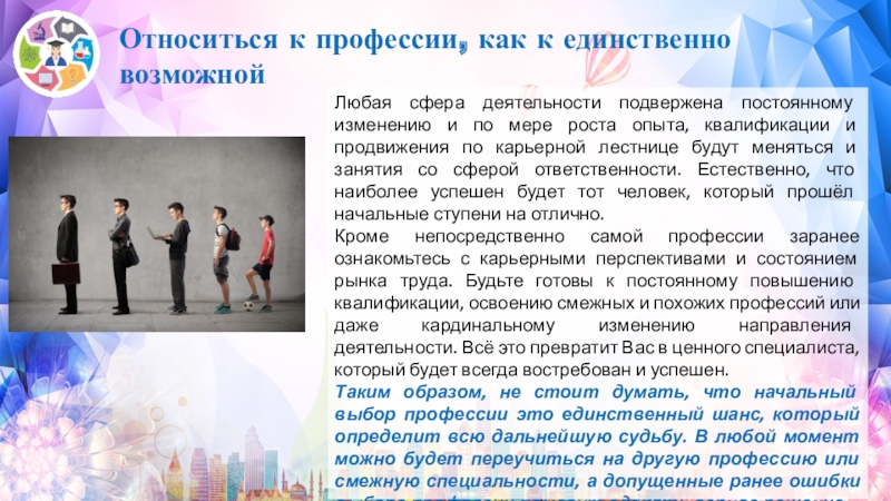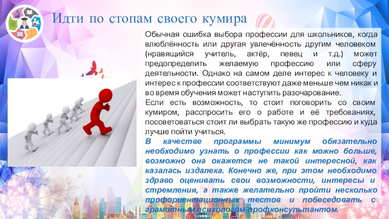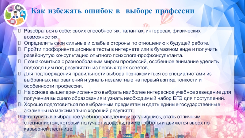 Познакомиться с разнообразным миром профессий, особенное внимание уделить подходящим под результаты из первых трёх советов.