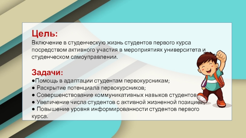 Цель: Включение в студенческую жизнь студентов первого курса посредством активного участия в мероприятиях университета и студенческом самоуправлении. Задачи: ●Помощь в адаптации студентам первокурсникам; ● Раскрытие потенциала первокурсников; ● Совершенствование коммуникативных