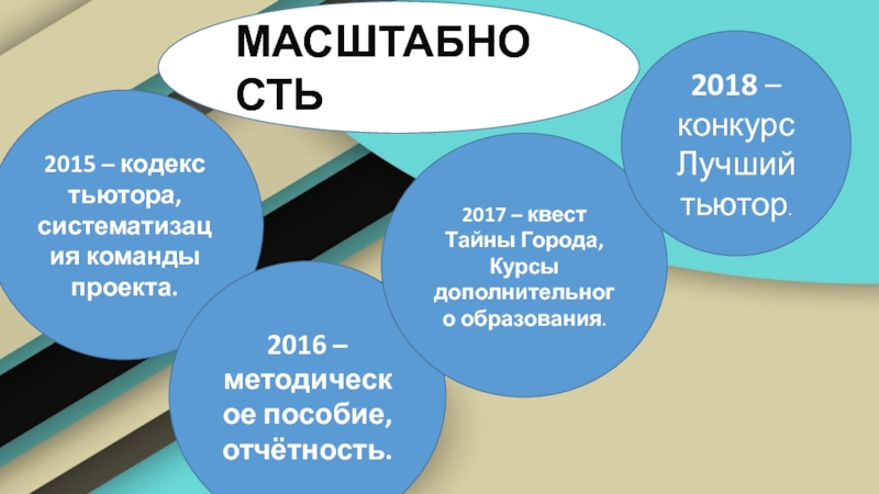 МАСШТАБНОСТЬ2015 – кодекс тьютора, систематизация команды проекта.2016 – методическое пособие, отчётность.2017 – квест Тайны Города, Курсы