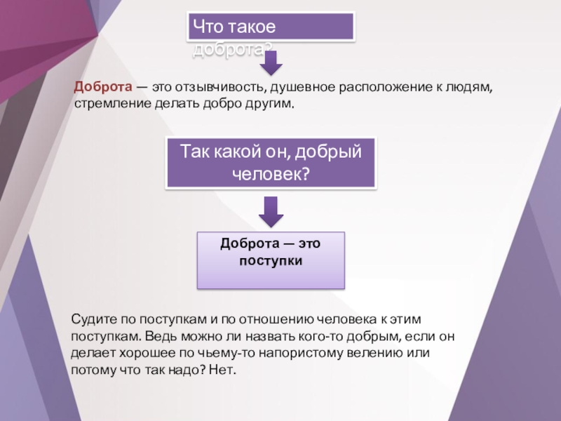 поступкиСудите по поступкам и по отношению человека к этим поступкам. Ведь можно ли назвать кого-то добрым, если он делает хорошее по чьему-то напористому велению или потому что так надо? Нет.