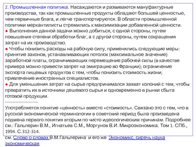 Отголоски меркантилистской торговой политики раздаются и сегодня. США, например, запрещают иностранным кораблям перевозить грузы между своими портами. Россия запрещает иностранным авиакомпаниям перевозить пассажиров между российскими городами.