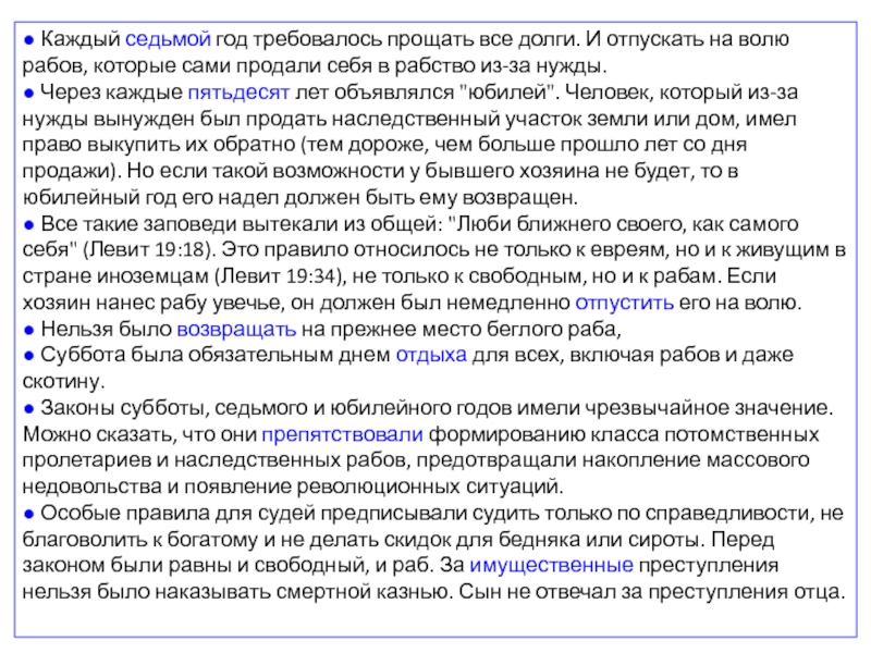 ● Законы субботы, седьмого и юбилейного годов имели чрезвычайное значение. Можно сказать, что они препятствовали формированию класса потомственных пролетариев и наследственных рабов, предотвращали накопление массового недовольства и появление революционных ситуаций.