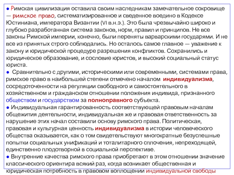 ● Сравнительно с другими, историческими или современными, системами права, римское право в наибольшей степени отмечено началом индивидуализма, сосредоточенности на регуляции свободного и самостоятельного в хозяйственном и гражданском отношении положения индивида, признанного обществом и государством за полноправного субъекта.