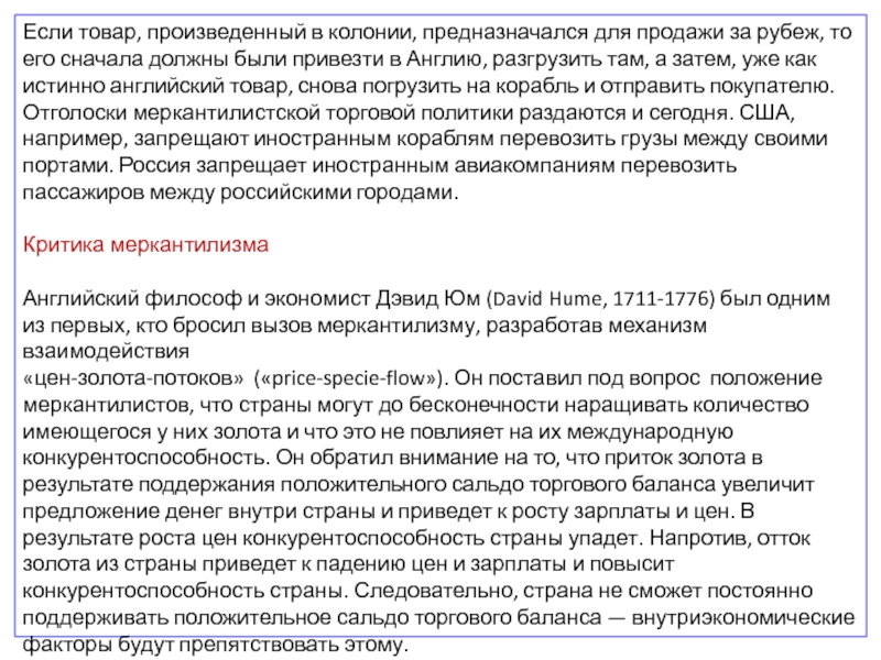 «цен-золота-потоков» («price-specie-flow»). Он поставил под вопрос положение меркантилистов, что страны могут до бесконечности наращивать количество имеющегося у них золота и что это не повлияет на их международную конкурентоспособность. Он обратил внимание на то, что приток золота в результате поддержания положительного сальдо торгового баланса увеличит предложение денег внутри страны и приведет к росту зарплаты и цен. В результате роста цен конкурентоспособность страны упадет. Напротив, отток золота из страны приведет к падению цен и зарплаты и повысит конкурентоспособность страны. Следовательно, страна не сможет постоянно поддерживать положительное сальдо торгового баланса — внутриэкономические факторы будут препятствовать этому.