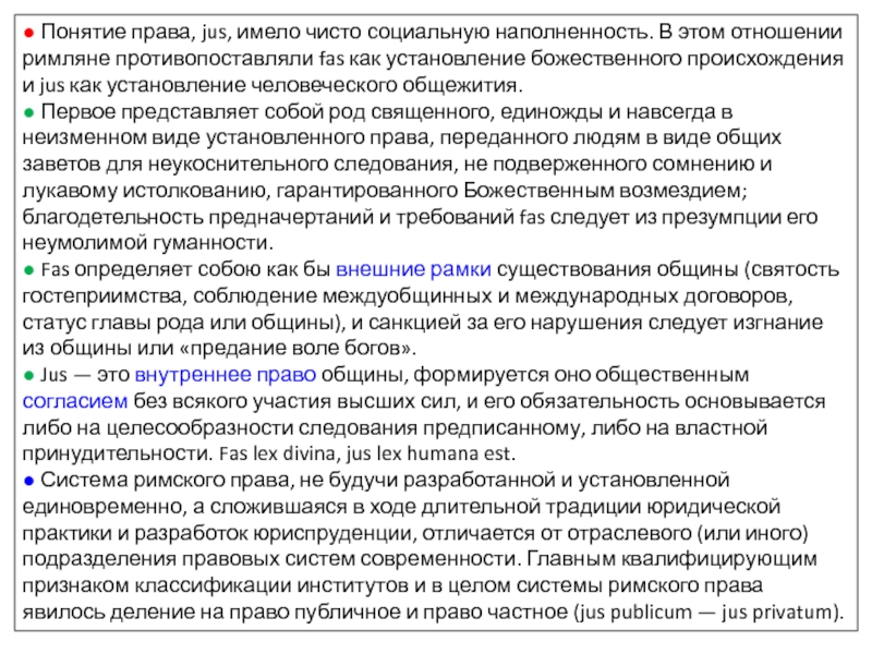 ● Jus — это внутреннее право общины, формируется оно общественным согласием без всякого участия высших сил, и его обязательность основывается либо на целесообразности следования предписанному, либо на властной принудительности. Fas lex divina, jus lex humana est.