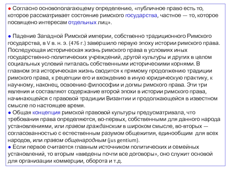 ● Общая концепция римской правовой культуры предусматривала, что требования права определяются, во-первых, собственными для данного народа установлениями, или правом гражданским в широком смысле, во-вторых — согласованностью с естественным разумом общежития, единообщим для всех народов, или правом общенародным (jus gentium).