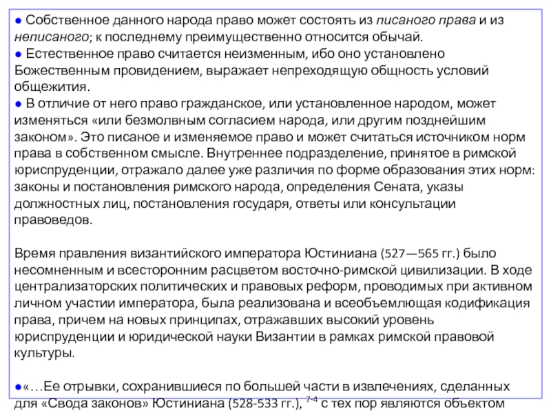 ● В отличие от него право гражданское, или установленное народом, может изменяться «или безмолвным согласием народа, или другим позднейшим законом». Это писаное и изменяемое право и может считаться источником норм права в собственном смысле. Внутреннее подразделение, принятое в римской юриспруденции, отражало далее уже различия по форме образования этих норм: законы и постановления римского народа, определения Сената, указы должностных лиц, постановления государя, ответы или консультации правоведов.