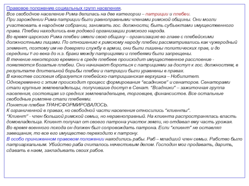 Одновременно с этим происходит процесс формирования “всадников” и сенаторов. Сенаторами стали крупные землевладельцы, получившие доступ в Сенат. “Всадники” – зажиточная группа населения, состоящая из средних землевладельцев, торговцев, финансистов. Все остальные свободные римляне стали плебеями.
