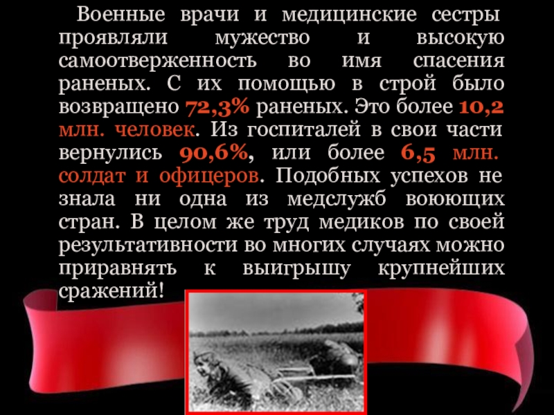 строй было возвращено 72,3% раненых. Это более 10,2 млн. человек. Из госпиталей в свои части вернулись 90,6%, или более 6,5 млн. солдат и офицеров. Подобных успехов не знала ни одна из медслужб воюющих стран. В целом же труд медиков по своей результативности во многих случаях можно приравнять к выигрышу крупнейших сражений!