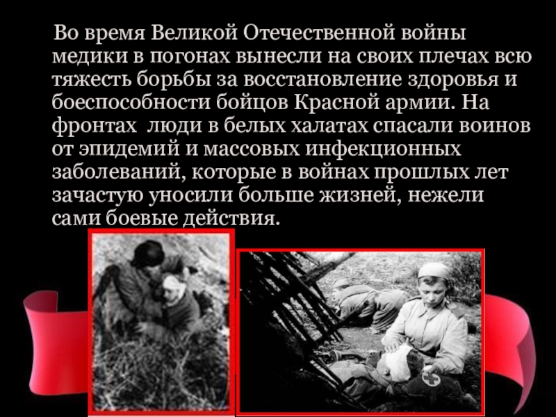 и боеспособности бойцов Красной армии. На фронтах люди в белых халатах спасали воинов от эпидемий и массовых инфекционных заболеваний, которые в войнах прошлых лет зачастую уносили больше жизней, нежели сами боевые действия.