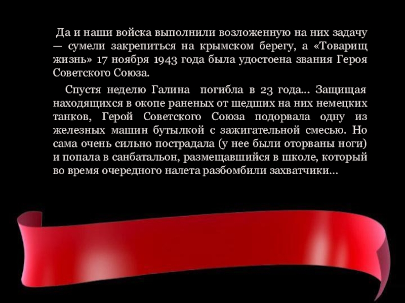 Спустя неделю Галина погибла в 23 года... Защищая находящихся в окопе раненых от шедших на них немецких танков, Герой Советского Союза подорвала одну из железных машин бутылкой с зажигательной смесью. Но сама очень сильно пострадала (у нее были оторваны ноги) и попала в санбатальон, размещавшийся в школе, который во время очередного налета разбомбили захватчики…