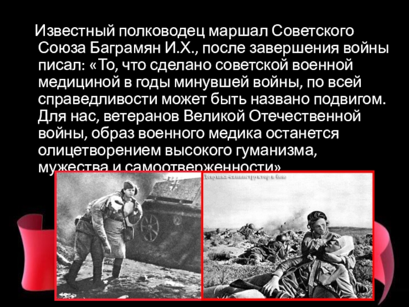 минувшей войны, по всей справедливости может быть названо подвигом. Для нас, ветеранов Великой Отечественной войны, образ военного медика останется олицетворением высокого гуманизма, мужества и самоотверженности».