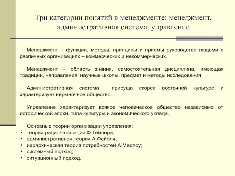 Слайд 10Три категории понятий в менеджменте: менеджмент, административная система, управление