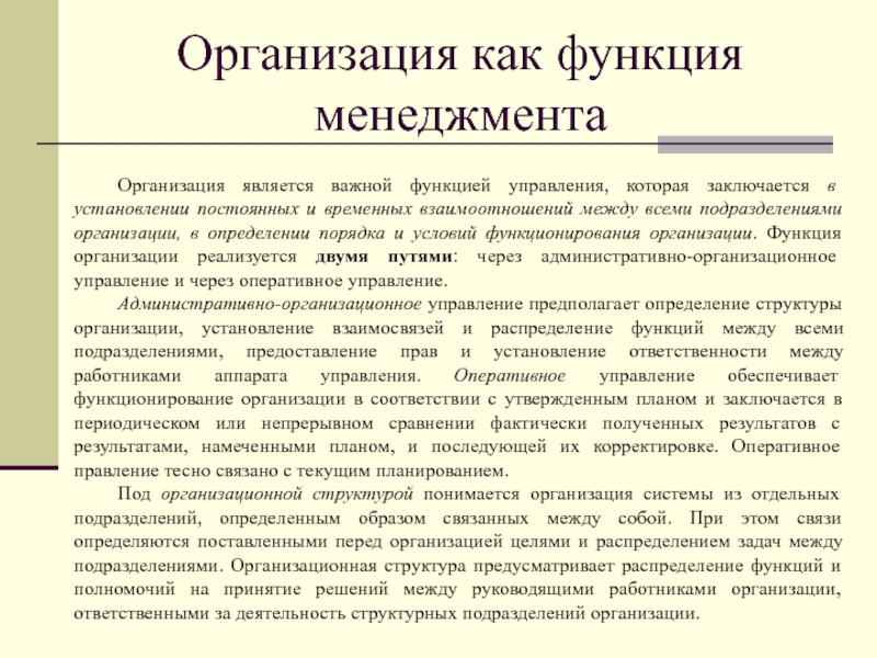 в определении порядка и условий функционирования организации. Функция организации реализуется двумя путями: через административно-организационное управление и через оперативное управление.