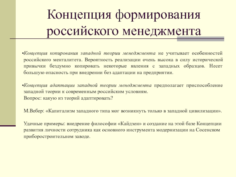 Концепция адаптации западной теории менеджмента предполагает приспособление западной теории к современным российским условиям.