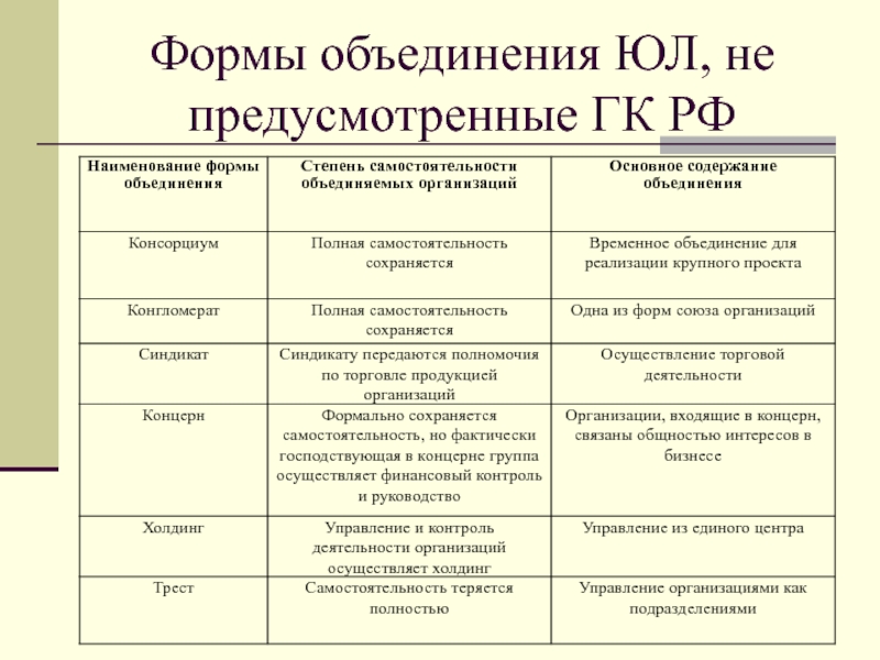 Слайд 20Формы объединения ЮЛ, не предусмотренные ГК РФ