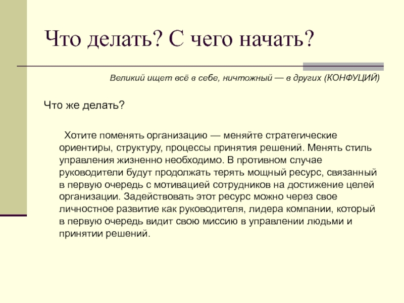 меняйте стратегические ориентиры, структуру, процессы принятия решений. Менять стиль управления жизненно необходимо. В противном случае руководители будут продолжать терять мощный ресурс, связанный в первую очередь с мотивацией сотрудников на достижение целей организации. Задействовать этот ресурс можно через свое личностное развитие как руководителя, лидера компании, который в первую очередь видит свою миссию в управлении людьми и принятии решений.