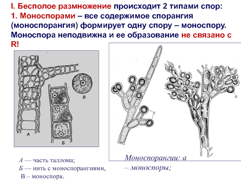 Слайд 22I. Бесполое размножение происходит 2 типами спор: