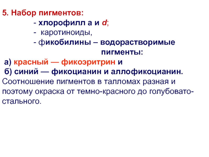б) синий — фикоцианин и аллофикоцианин. Соотношение пигментов в талломах разная и поэтому окраска от темно-красного до голубовато-стального.