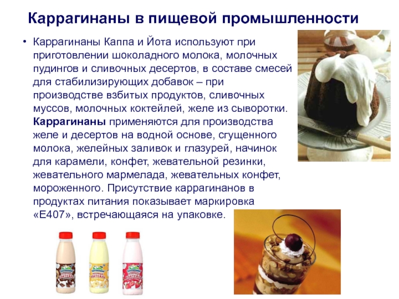 для стабилизирующих добавок – при производстве взбитых продуктов, сливочных муссов, молочных коктейлей, желе из сыворотки. Каррагинаны применяются для производства желе и десертов на водной основе, сгущенного молока, желейных заливок и глазурей, начинок для карамели, конфет, жевательной резинки, жевательного мармелада, жевательных конфет, мороженного. Присутствие каррагинанов в продуктах питания показывает маркировка «E407», встречающаяся на упаковке.