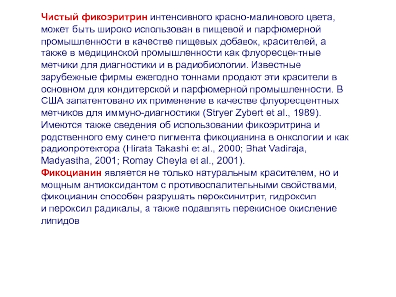 также в медицинской промышленности как флуоресцентные метчики для диагностики и в радиобиологии. Известные зарубежные фирмы ежегодно тоннами продают эти красители в основном для кондитерской и парфюмерной промышленности. В США запатентовано их применение в качестве флуоресцентных метчиков для иммуно-диагностики (Stryer Zybert et al., 1989). Имеются также сведения об использовании фикоэритрина и родственного ему синего пигмента фикоцианина в онкологии и как радиопротектора (Hirata Takashi et al., 2000; Bhat Vadiraja, Madyastha, 2001; Romay Cheyla et al., 2001).