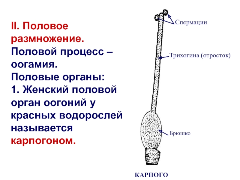 КАРПОГOН (от греч. karpos - плод и гонэ) - женский гаметангий большинства красных водорослей, состоящий из расширенной базальной части - брюшка, заключающего яйцеклетку, и узкой – трихогины.