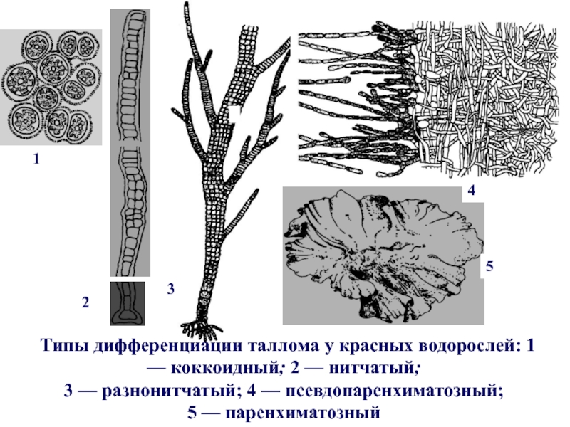 Слайд 15 Типы дифференциации таллома у красных водорослей: 1 — коккоидный;