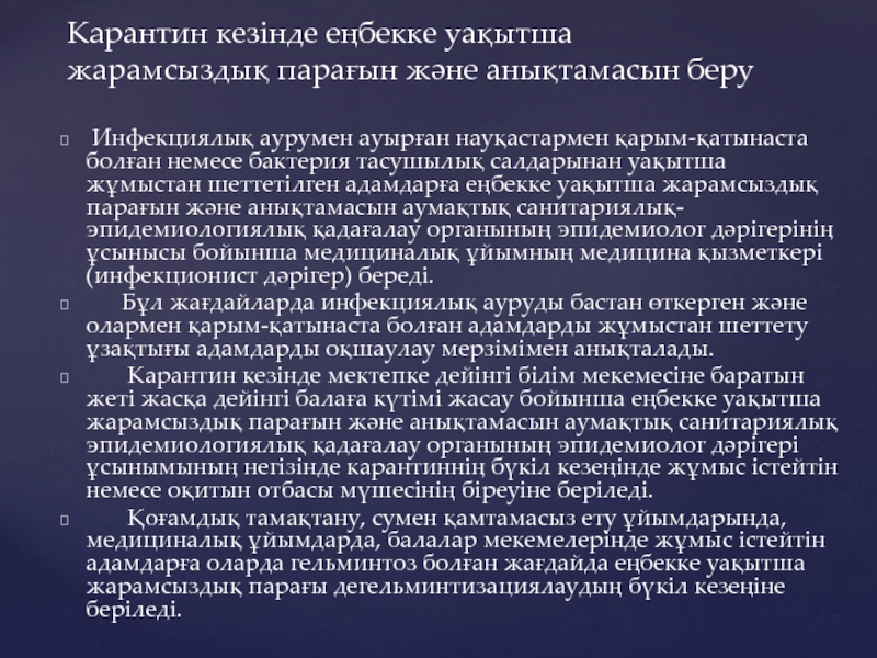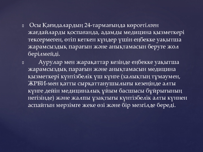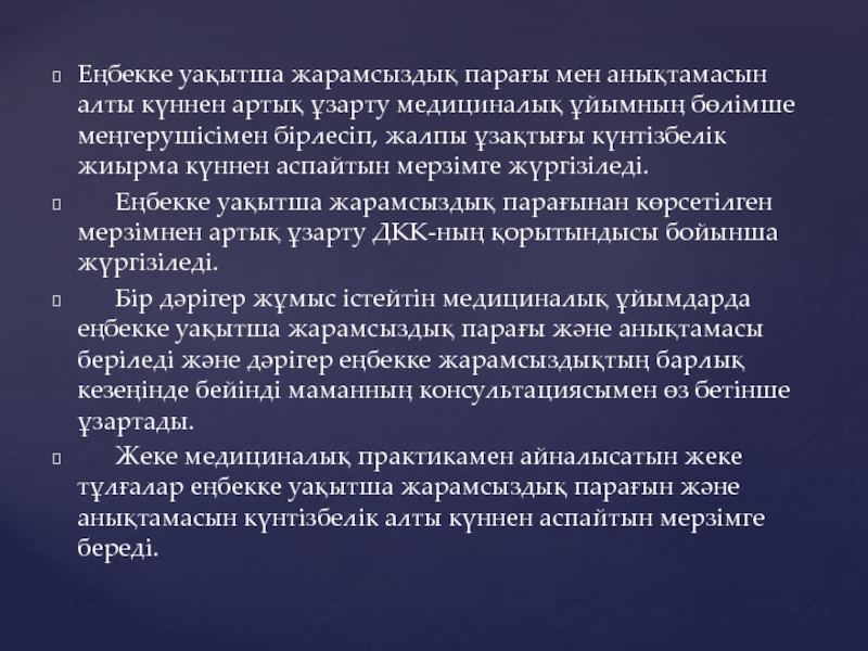 Слайд 14Еңбекке уақытша жарамсыздық парағы мен анықтамасын алты күннен артық ұзарту