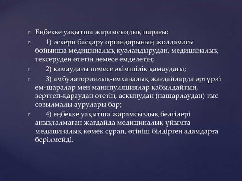 4) еңбекке уақытша жарамсыздық белгілері анықталмаған жағдайда медициналық ұйымға медициналық көмек сұрап, өтініш білдірген адамдарға берілмейді.