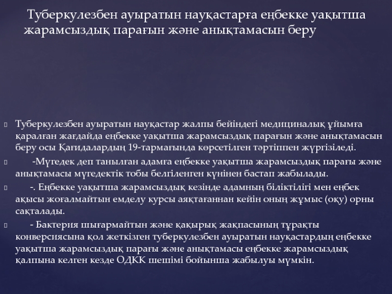 - Бактерия шығармайтын және қақырық жақпасының тұрақты конверсиясына қол жеткізген туберкулезбен ауыратын науқастардың еңбекке уақытша жарамсыздық парағы және анықтамасы еңбекке жарамсыздық қалпына келген кезде ОДКК шешімі бойынша жабылуы мүмкін.