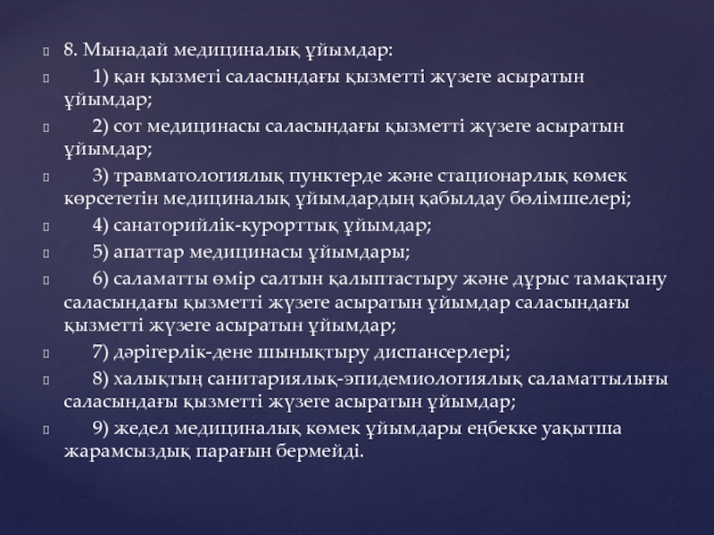 9) жедел медициналық көмек ұйымдары еңбекке уақытша жарамсыздық парағын бермейді.