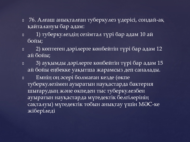 Слайд 21 76. Алғаш анықталған туберкулез үдерісі, сондай-ақ қайталануы бар адам:
