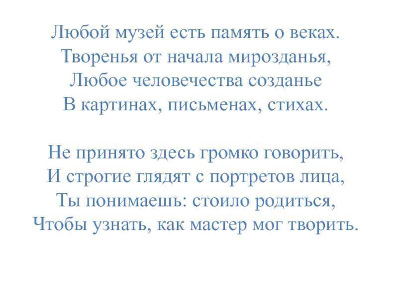 Слайд 14Любой музей есть память о веках. Творенья от начала мирозданья, Любое человечества