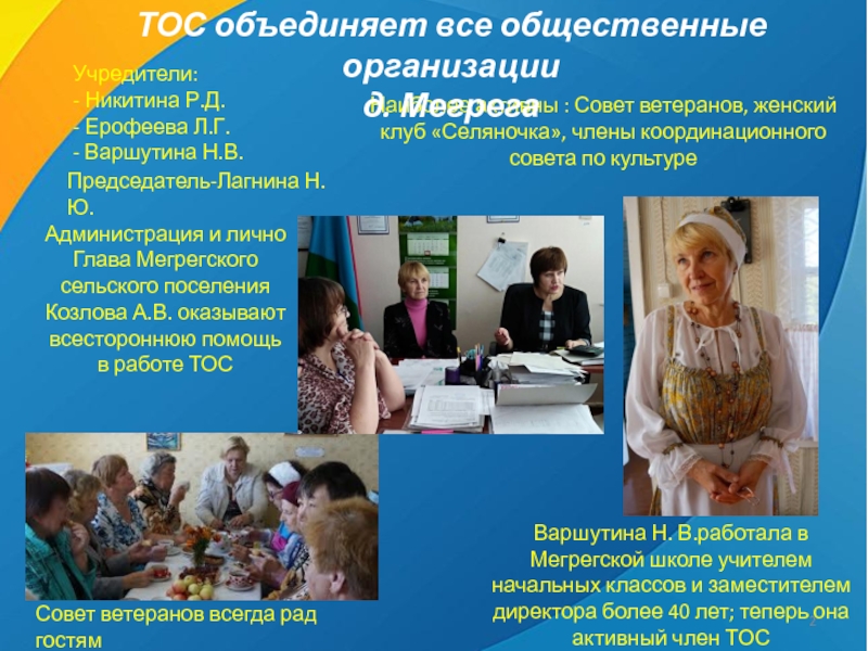 Варшутина Н. В.работала в Мегрегской школе учителем начальных классов и заместителем директора более 40 лет; теперь она активный член ТОС