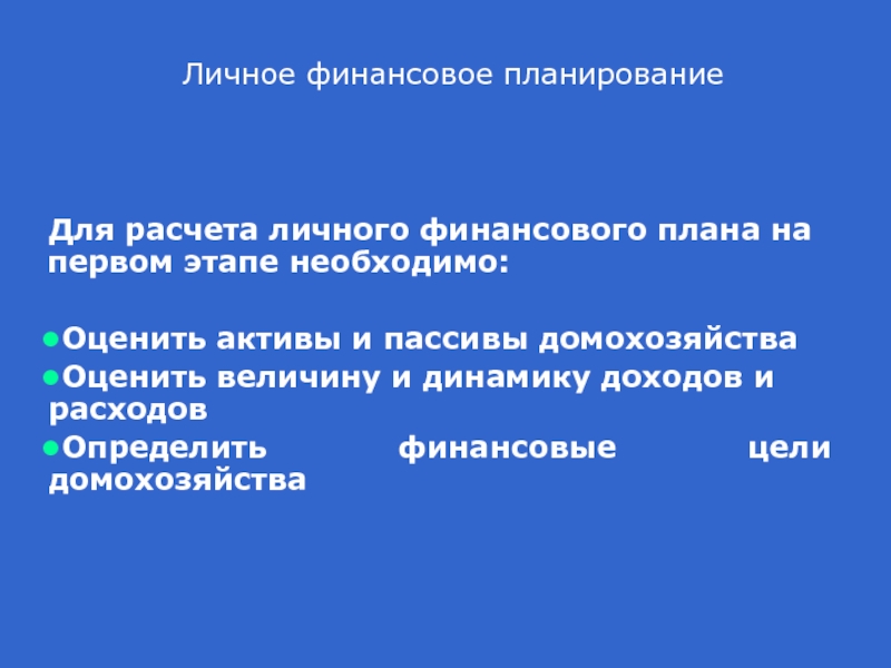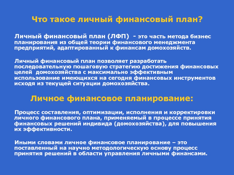 финансового планирования, должен сформироваться личный финансовый план, в котором все цели имеют финансирование.