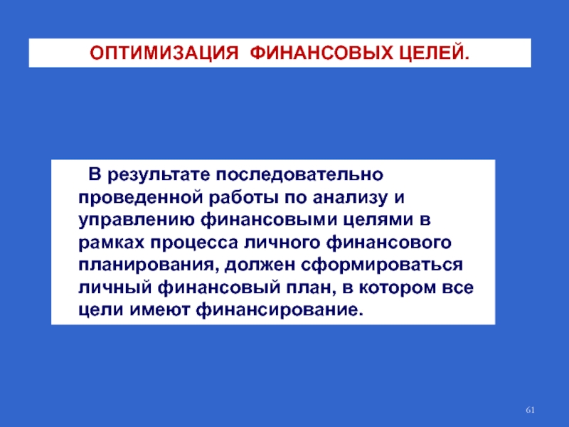 Слайд 61ОПТИМИЗАЦИЯ ФИНАНСОВЫХ ЦЕЛЕЙ.