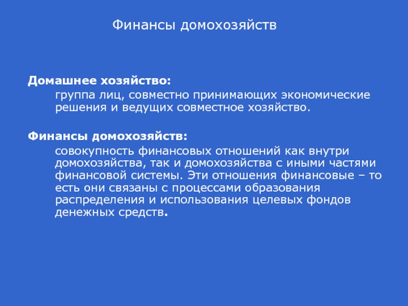 совокупность финансовых отношений как внутри домохозяйства, так и домохозяйства с иными частями финансовой системы. Эти отношения финансовые – то есть они связаны с процессами образования распределения и использования целевых фондов денежных средств.