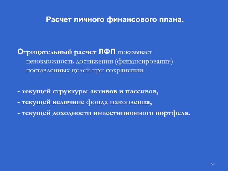 Слайд 59Отрицательный расчет ЛФП показывает невозможность достижения (финансирования) поставленных целей при