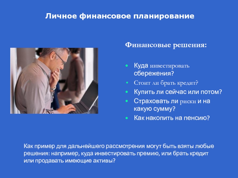 Как пример для дальнейшего рассмотрения могут быть взяты любые решения: например, куда инвестировать премию, или брать кредит или продавать имеющие активы?