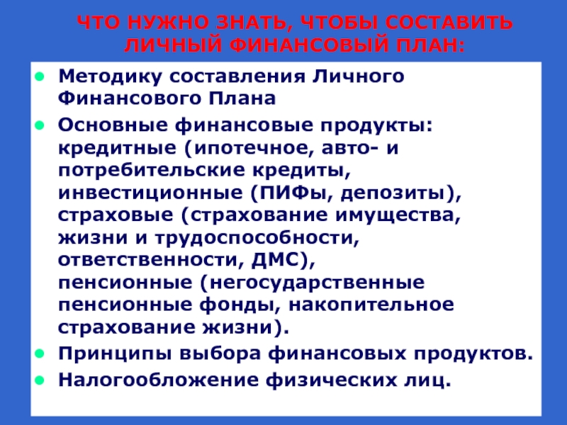 Слайд 64ЧТО НУЖНО ЗНАТЬ, ЧТОБЫ СОСТАВИТЬ ЛИЧНЫЙ ФИНАНСОВЫЙ ПЛАН: