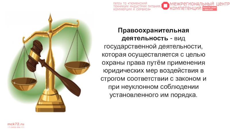 Правоохранительная деятельность - вид государственной деятельности, которая осуществляется с целью охраны права путём применения юридических мер воздействия в