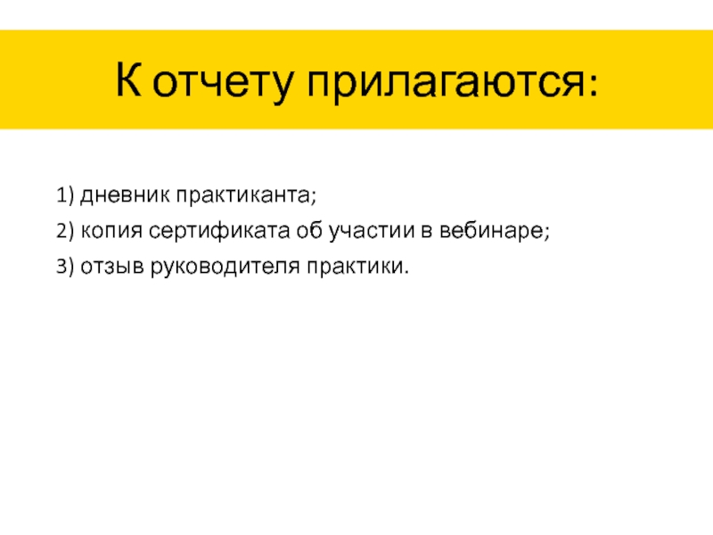 К отчету прилагаются:1) дневник практиканта;2) копия сертификата об участии в вебинаре;3) отзыв руководителя практики.