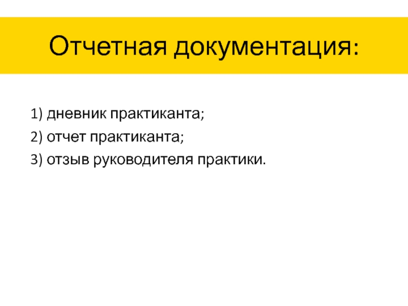 Отчетная документация:1) дневник практиканта;2) отчет практиканта;3) отзыв руководителя практики.